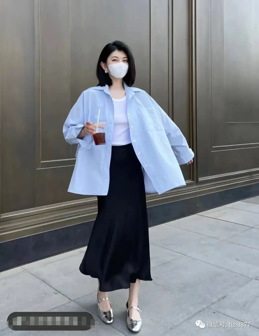 look2 浅蓝色衬衫+白色半裙
