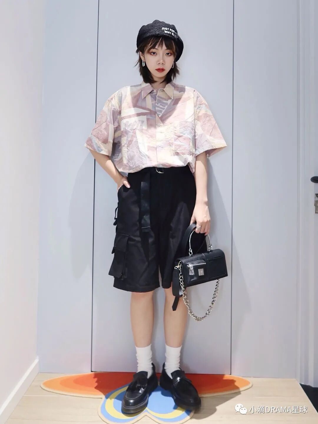 粉色几何图案的花衬衫,整体给人整洁舒适的感觉,作为百搭色的黑色短裤什么样的花衬衫都能hold 住,粉色和黑色的碰撞,摩登又时尚,再搭配上小皮鞋,尽显鬼马俏皮 。