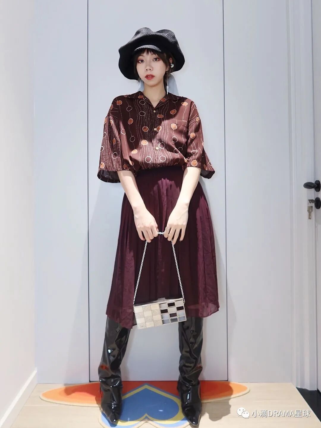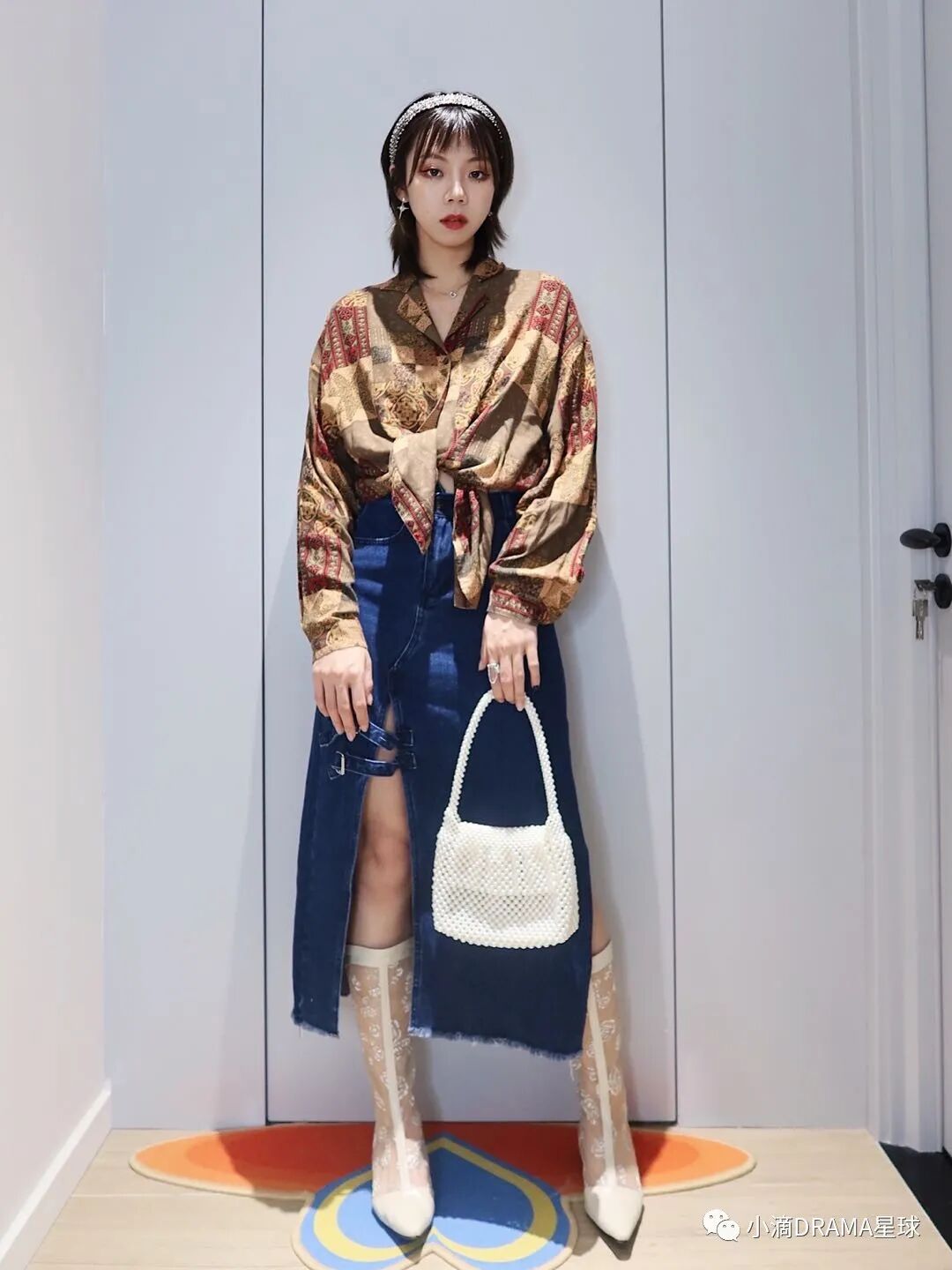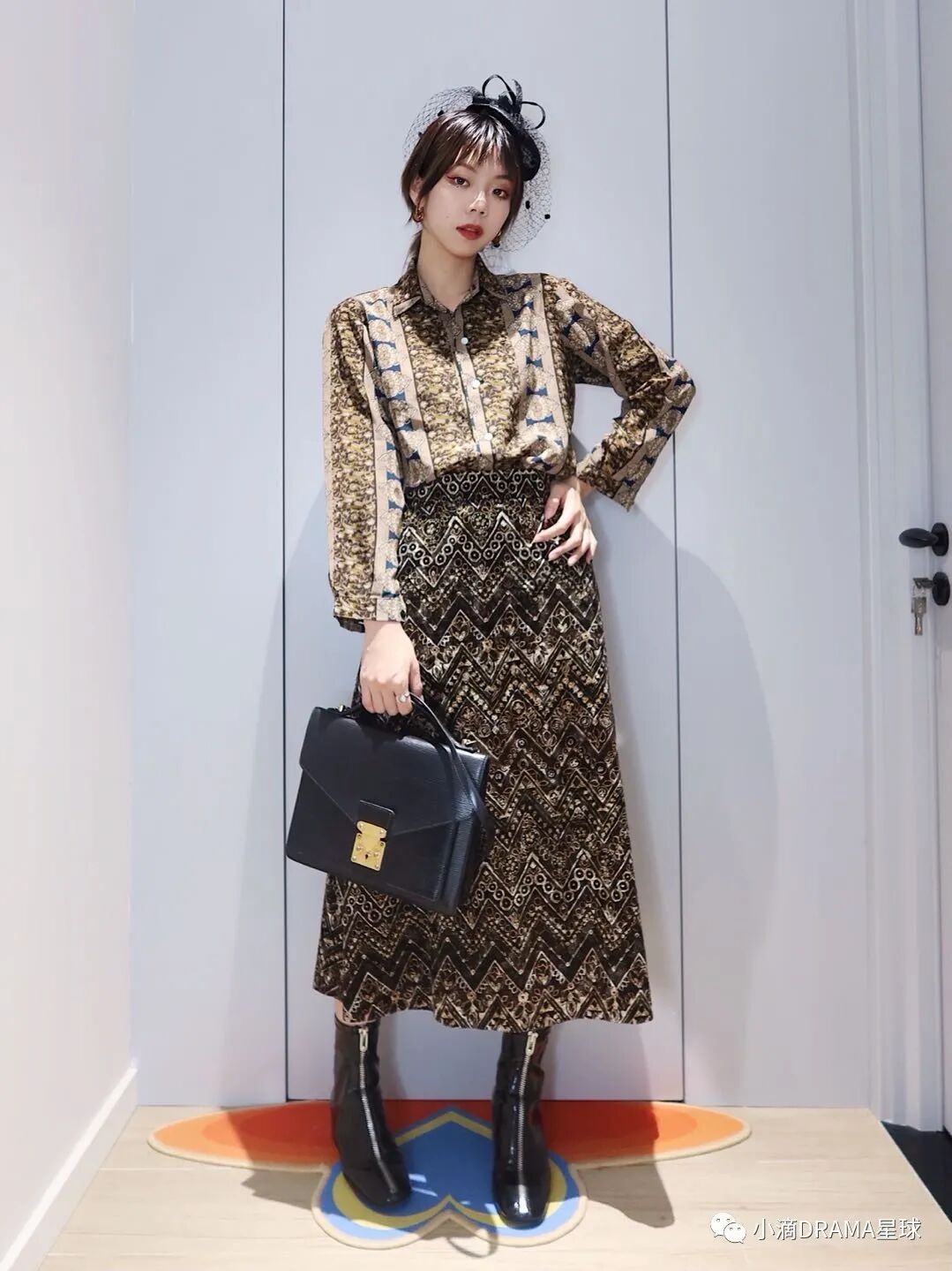 选择颜色相同但是花色不一样的衬衫和半身裙搭配,同色系起到了有效缓解花色不一样的繁琐感,虽然有点考验穿搭功力,但穿好了就是顶配高级。