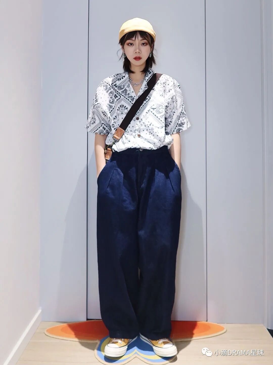 花衬衫搭配深色牛仔裤,经典又不会出错,把衬衫塞进宽松的牛仔裤里面,视觉上提高腰线,搭配帆布鞋,简单休闲还日常。