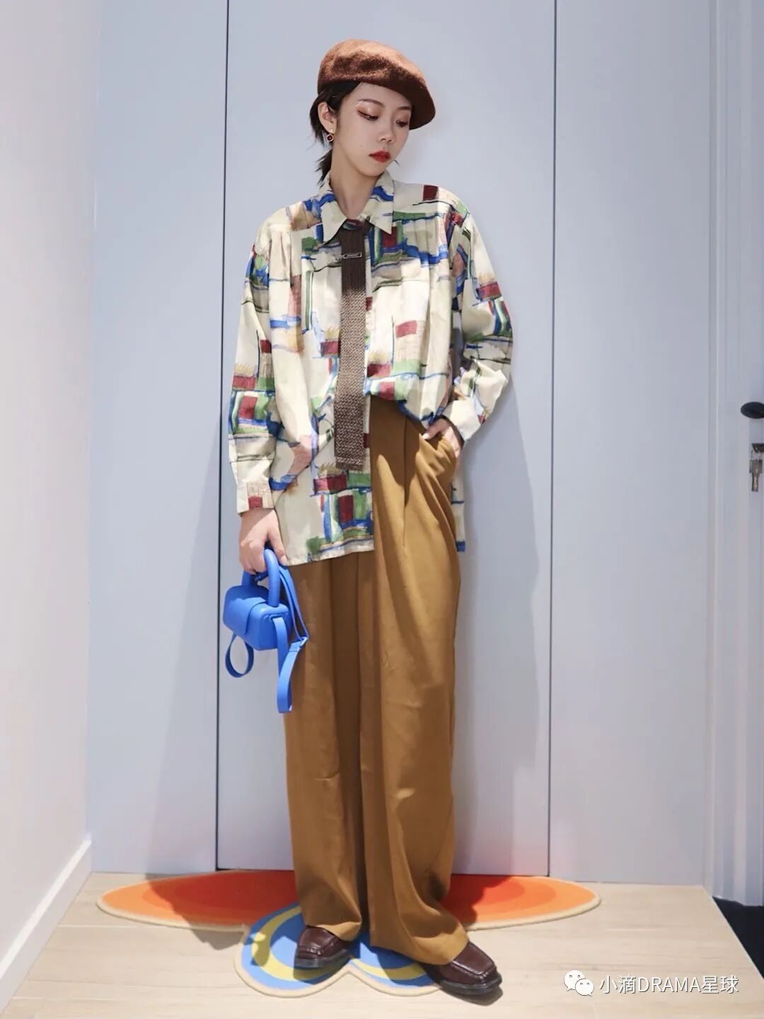 米色衬衫搭配棕色西裤,上下色彩统一不会过于抢眼,更有复古文艺范儿,蓝色包包恰到好处的吸睛,无论是去通勤还是约会都超级大方!