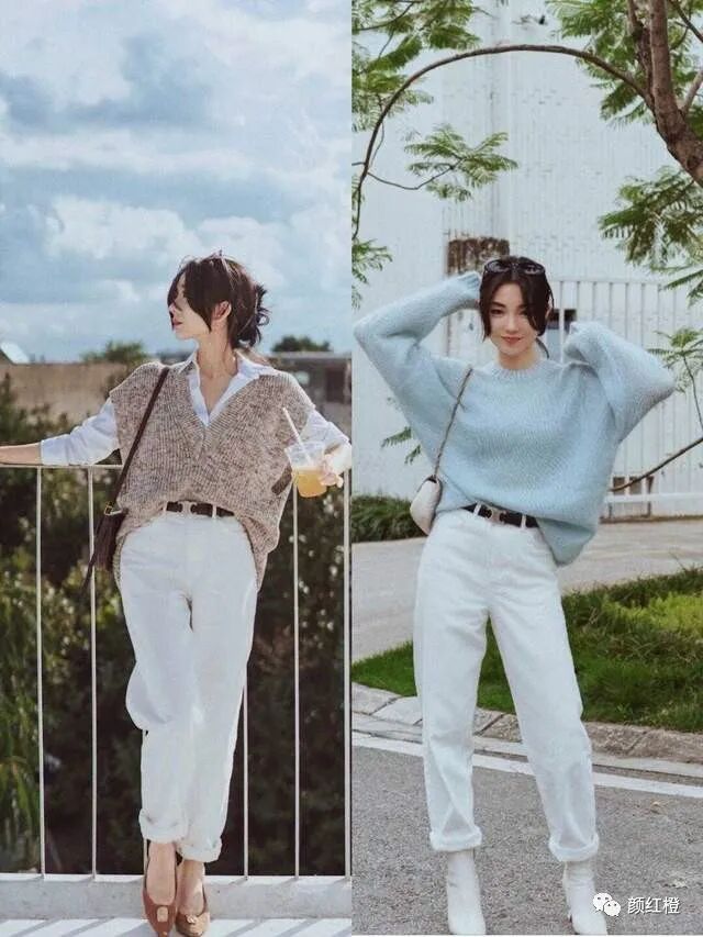 就像这位时尚博主一样,直接选择一款针织衫,而且是白色的套头针织衫,虽然白色显得非常高级,然后搭配一款不一样的半身裙,还有一种繁简结合的感觉。