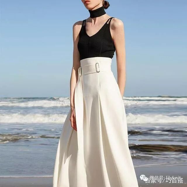 一款复古高腰大摆的半身裙,简约的黑白两色,实力百搭。敲高腰的设计,轻松穿出胸以下全是腿的既视感,而且腰头的金属扣腰带装饰,形成了花苞的腰头,多了份柔美感, 整体还不会显得单调 。