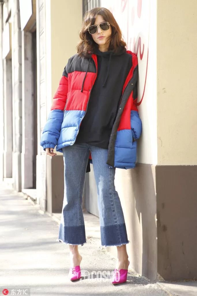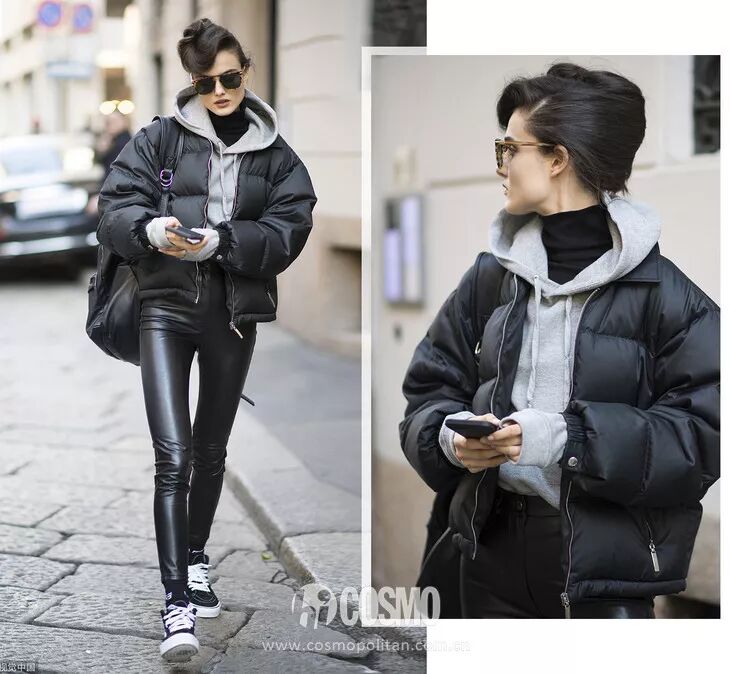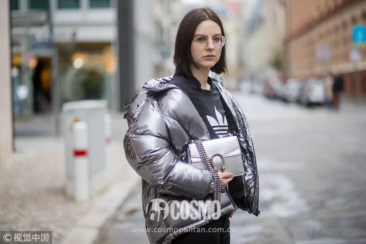 今年流行的金属色羽绒服非常适合搭配卫衣穿着,银色羽绒服搭配运动卫衣,温暖舒适又不输时髦。
