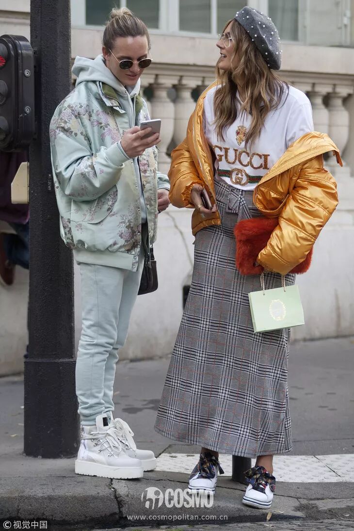 虽然羽绒服这件单品与“复古”不沾边儿,但金色绣花卫衣搭配橘色亮面羽绒服倒是有些复古的味道,冬季穿件长半裙也是个温暖又时髦的选择呢。