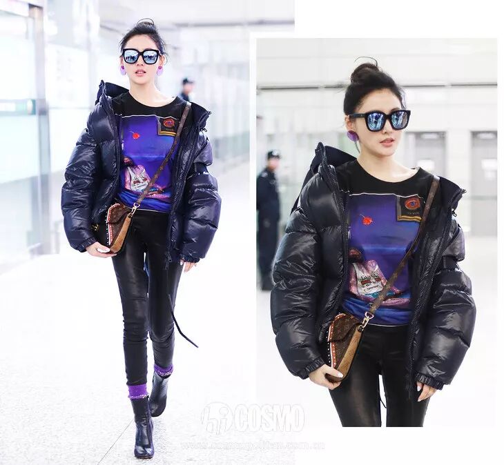 比起袁姗姗的烟囱领卫衣,张天爱这件圆领卫衣印花更复杂。这件来自Gucc的动物织花拼色卫衣乍看之下并不好穿,但是搭配短款羽绒服就没什么问题。短靴中露出的紫袜和淡紫色耳饰十分瞩目。
