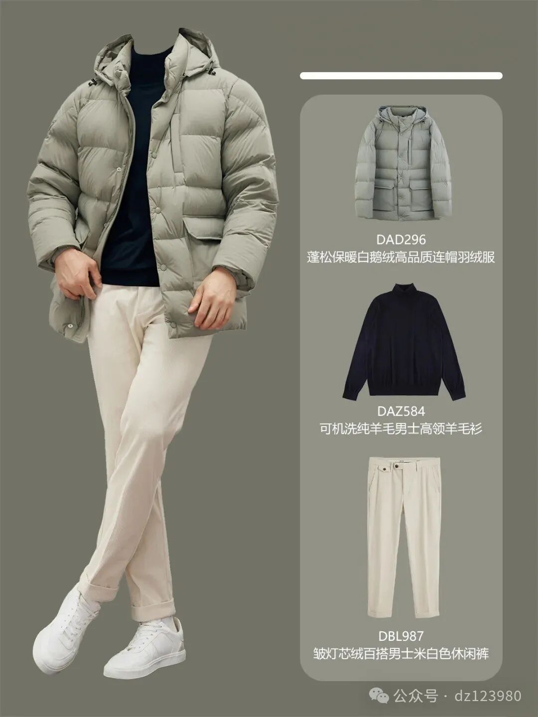 ?第二套:灰色连帽立领羽绒服+高领羊毛衫+米白色灯芯绒百搭休闲裤+小白鞋