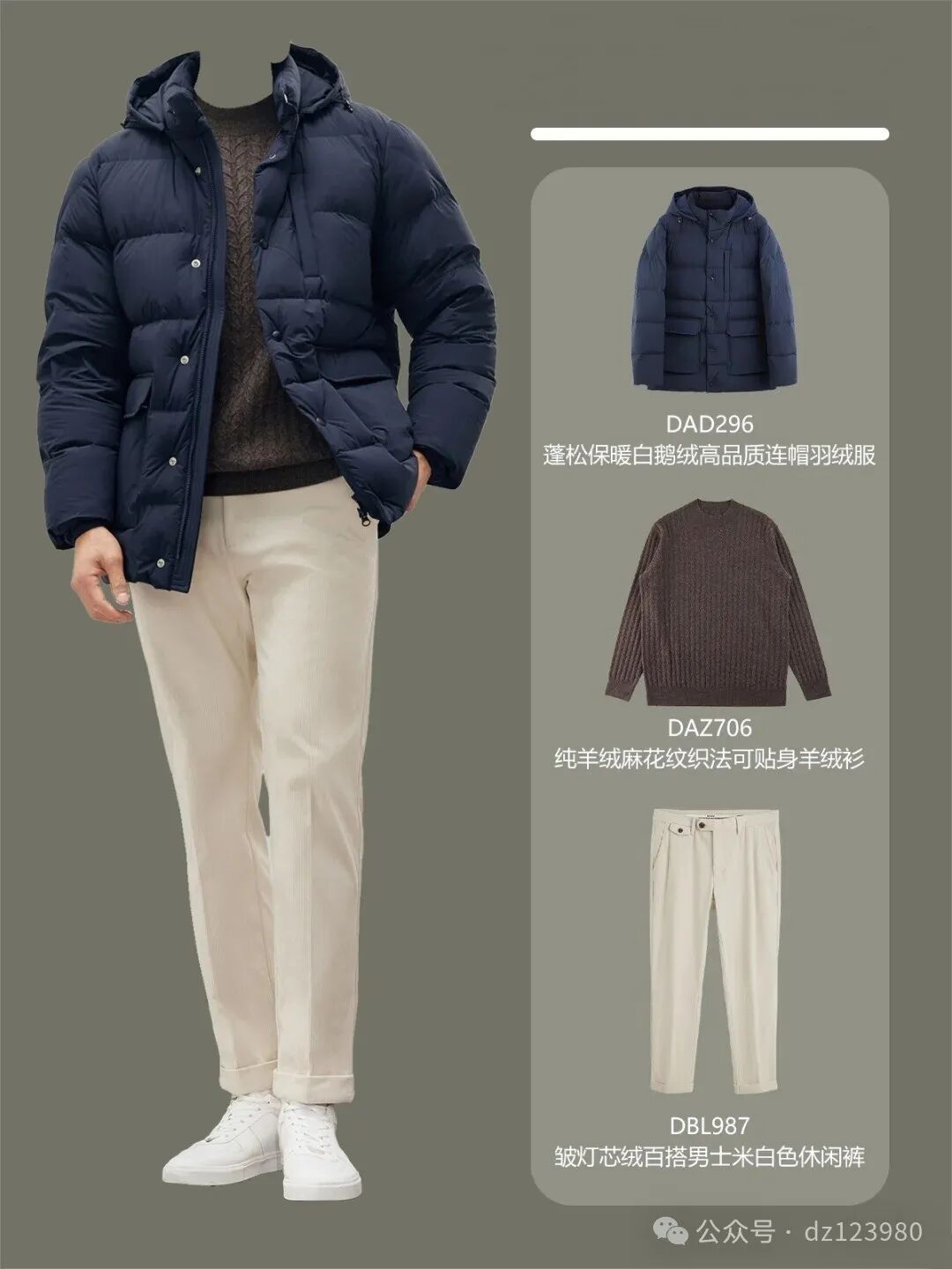 ?第三套:藏蓝色连帽立领羽绒服+羊绒麻花纹羊毛衫+米白色灯芯绒休闲裤+小白鞋