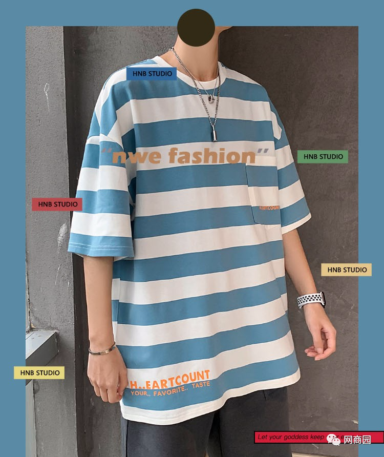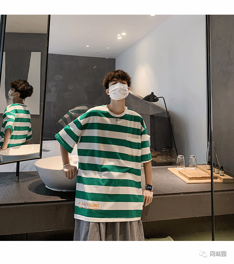 如果不喜欢黑白T恤的你,可以试试浅色系条纹T,浅色永远给人干净,清爽的视觉感,搭配起来不会显得太单调也不会太花哨。
