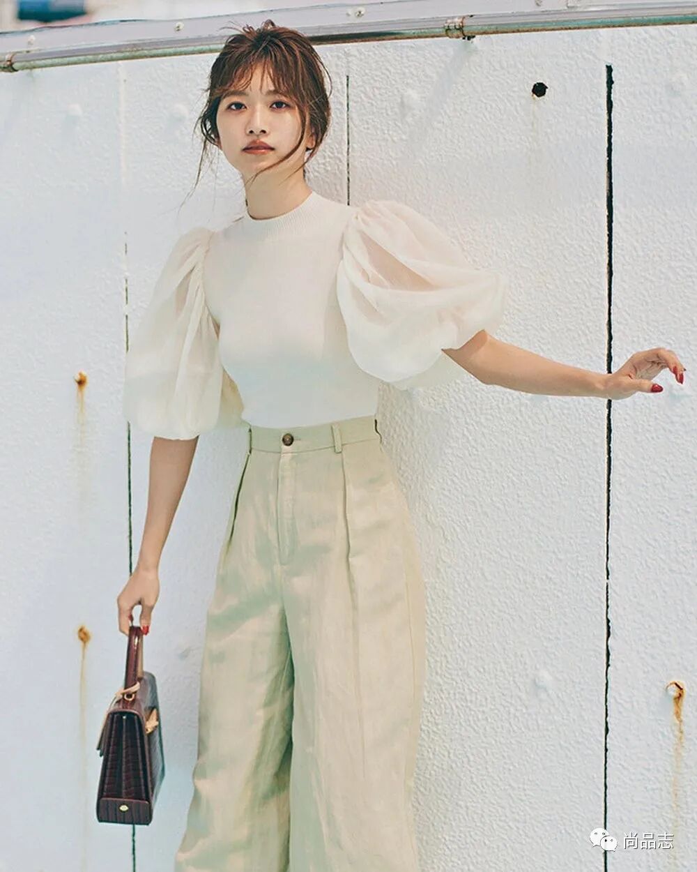 那对于手臂比较粗肩膀比较厚的苹果型身材的宝宝们,自然是要换成下面的收身大泡泡袖款式,把上衣塞进裤子里,还能显高又显瘦。