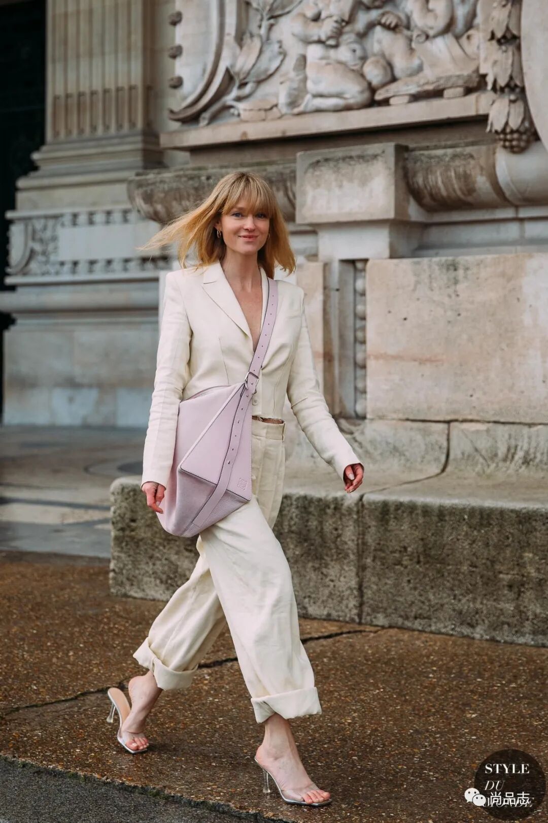 夏日里得体不显沉闷又能穿着很显档次的西服套装当属白色系。如果你想要时髦元素多一点,可以把裤子卷起来一点,搭配淡淡的浅紫色包包,扑面而来的优雅。