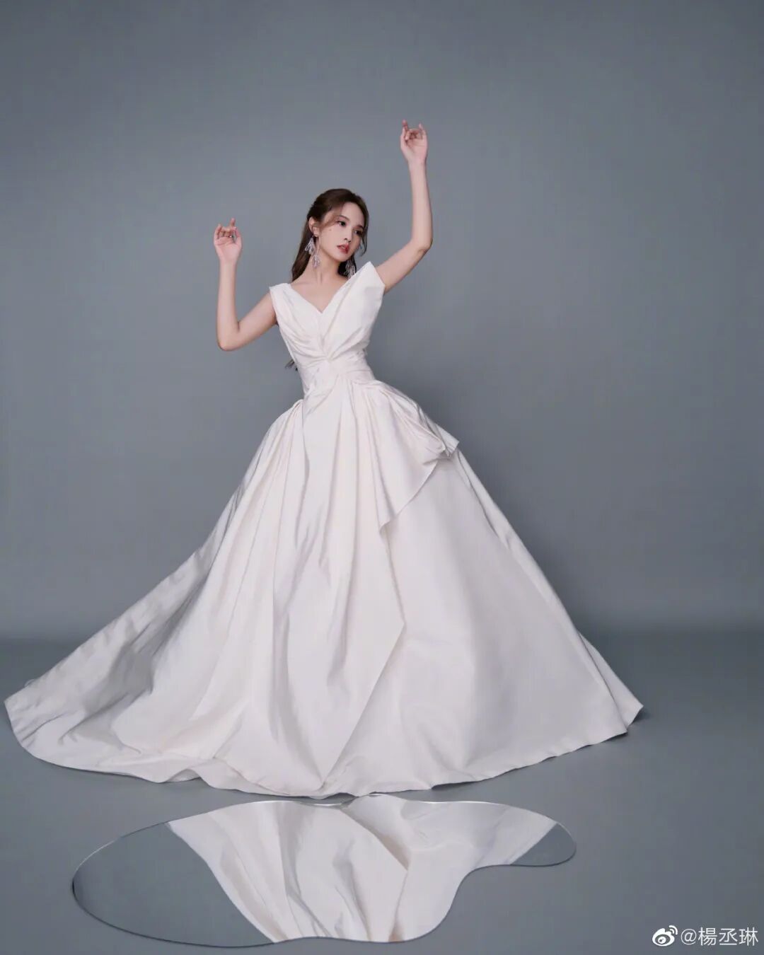 毕竟是萧邦的品牌大使,杨紫佩戴的珠宝选的也是萧邦,造型与裙子上的花瓣呼应上了。