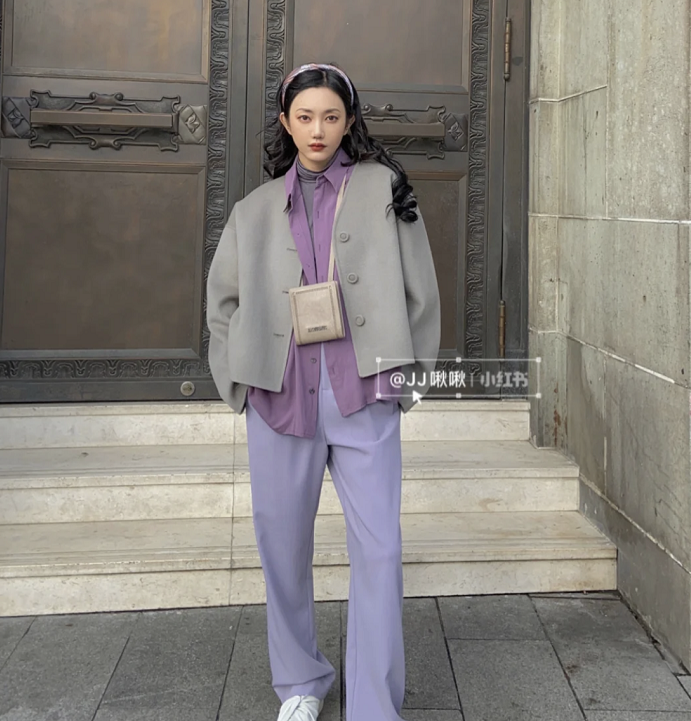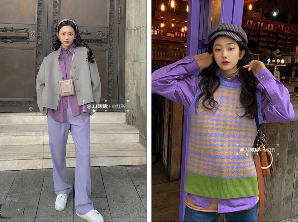 紫色系穿搭简直太绝了!不管是烟灰色+紫色系,还是黄绿+紫色系,都是有眼可见的高级,尤其是左图穿搭,真的可以学起来!