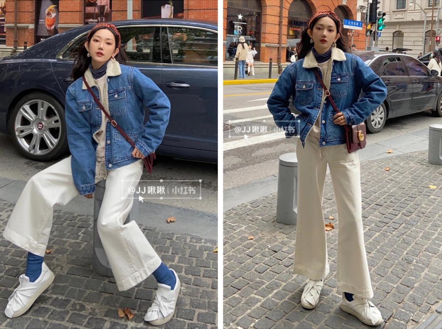 不管是搭配奶白色开衫,还是米色针织马甲,都能是知性又优雅,微喇牛仔裤显高又显瘦,又给整体增加了复古感。