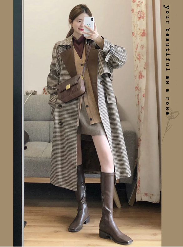 秋冬最常穿的长款大衣,搭配连衣长裙可以把外套系上穿,要腰带强调腰线,