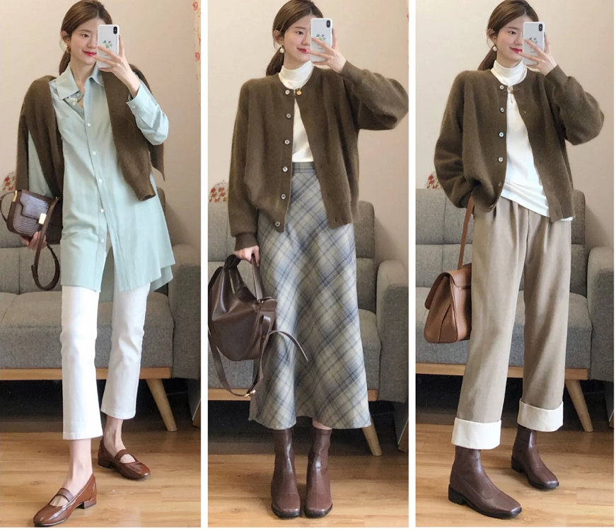就简单的棕绿色小开衫,都能有休闲、温柔、简约,3种不同的穿搭,不但可以搭配直筒裤和半裙,还能把针织开衫当做披肩外搭!