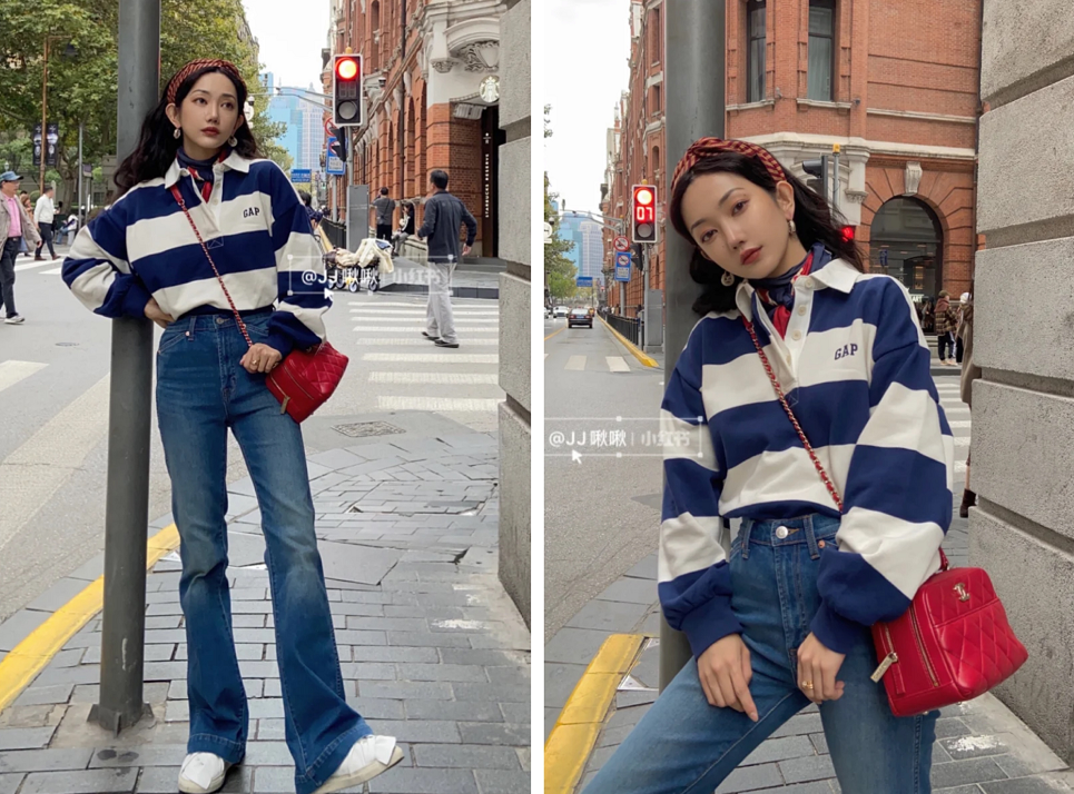 同样是蓝+白+红的穿搭,把重点变成了红色包包,用发带呼应,让蓝白上衣和牛仔酷作陪。