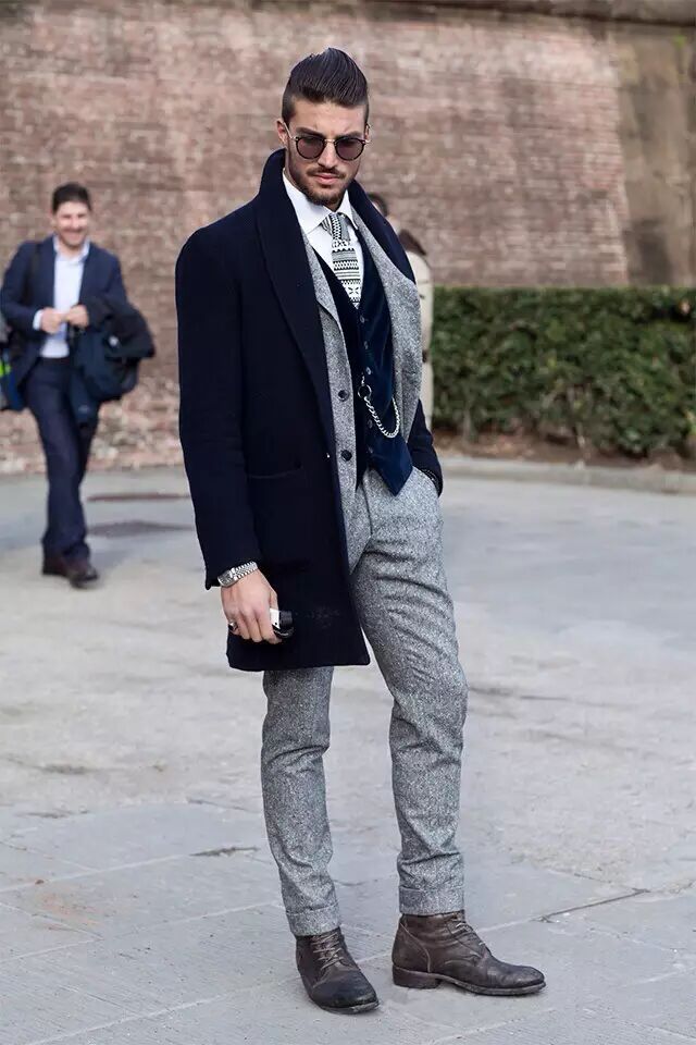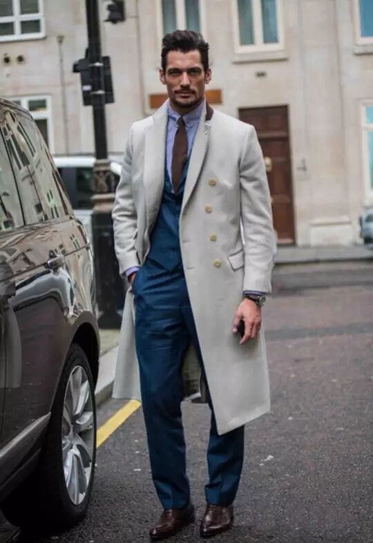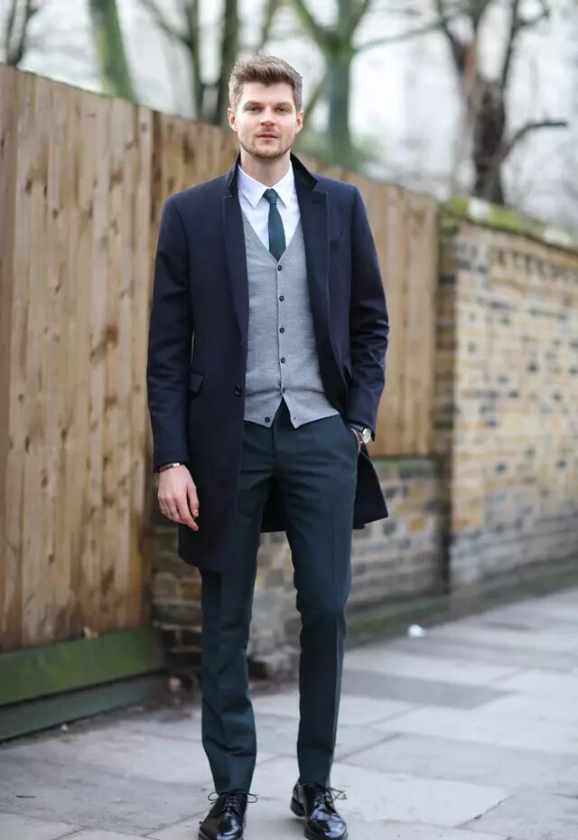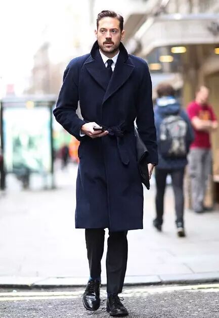 没有超模般的身材,建议选择至大腿中部长度的大衣就好,领带与裤子颜色的一致,还有锃亮的皮鞋,都是我们关注的焦点!