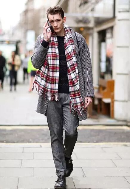 随意的亮色格子围巾围在脖子上,浅灰色西裤加灰色系亚麻大衣,穿出优雅绅士的气质。