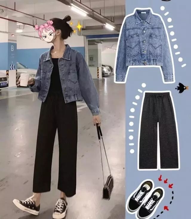 5、牛仔短外套+黑色阔腿裤