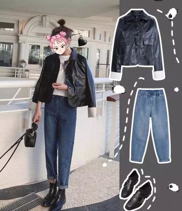酷酷的又带点帅气的短皮外套,简直就是为小个子量身定做的嘛~内搭白色短袖t+九分牛仔哈伦裤,裤脚处微微卷起一下,露出脚踝肌肤,视觉上轻松就拉长双腿比例了,腿短个矮的女生就这么穿,显高挑又时尚。
