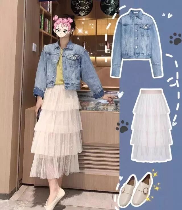1、牛仔短外套+白色网纱蛋糕裙