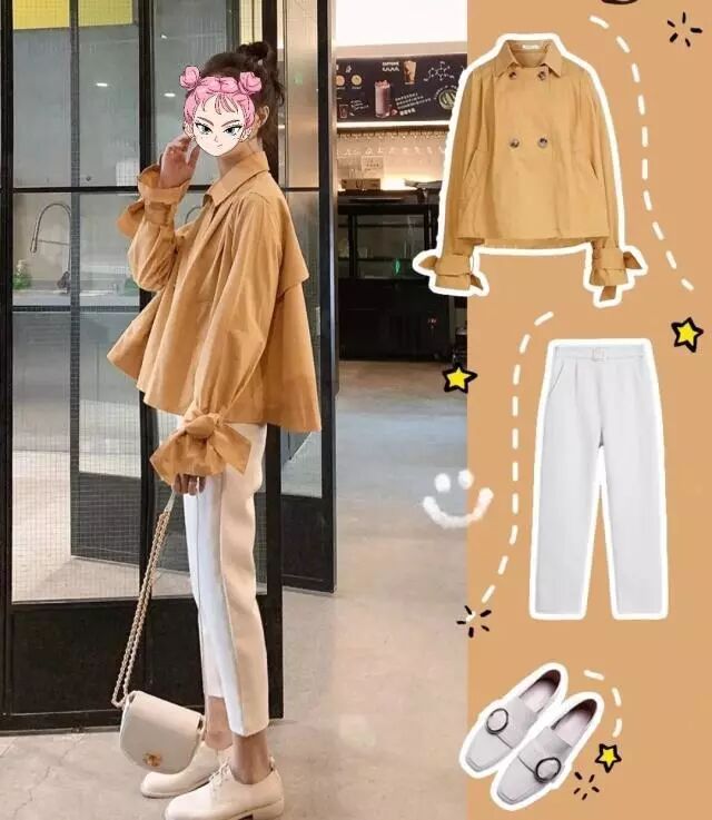 这个颜色的短外套,也是很不挑人的,至少黄黑皮女生也能驾驭,浅浅色调的黄色系,小翻领设计,袖子处系带扎袖设计,利落气息尽显。搭配白色九分直筒裤,很温柔和谐的配色,春天小个子女生不妨照着这么穿,显高挑更时尚。