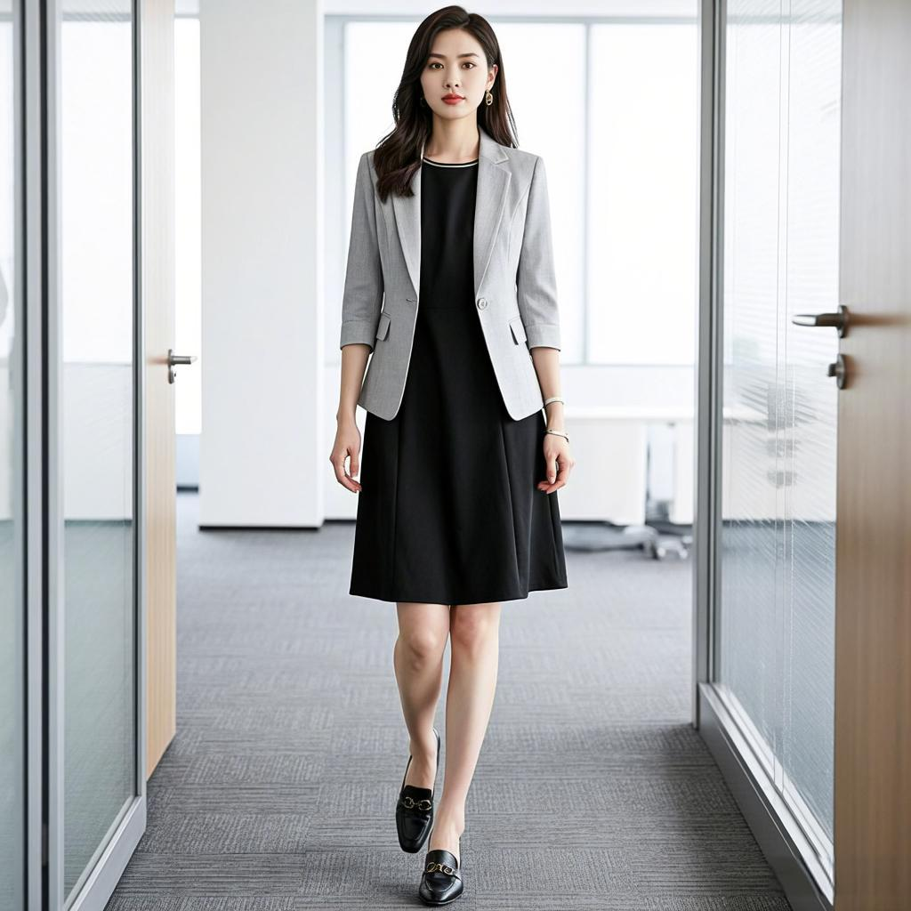 在职场中,连衣裙的穿搭要简洁大方,同时又得展现出专业和自信。可以选择一些颜色素净、款式简约的连衣裙,再搭配西装外套和简约的高跟鞋。比如说,黑色连衣裙搭配灰色西装外套,再配上一双中跟皮鞋,整个人看上去干练又时尚,非常适合在职场中展现专业形象。