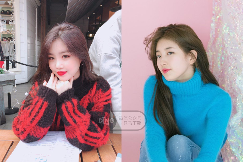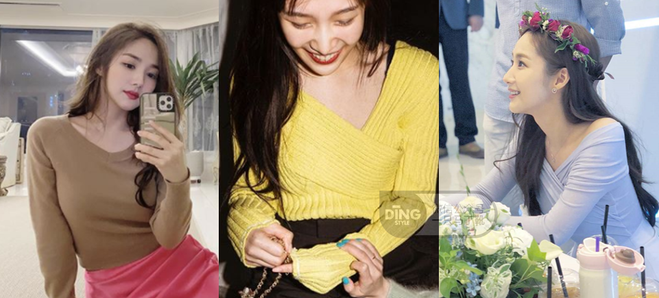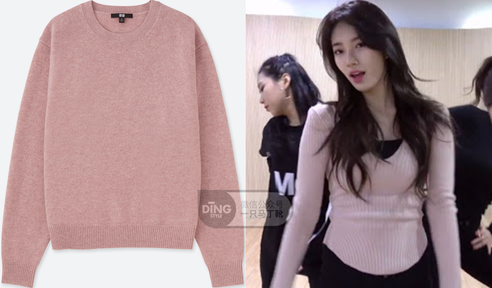 拿这两件粉色毛衣对比,左边是很常见的圆领基础款,上身可能全靠颜值气质撑,而秀智这件修身大V领的款式显然更容易发挥皮肤身材的优势。