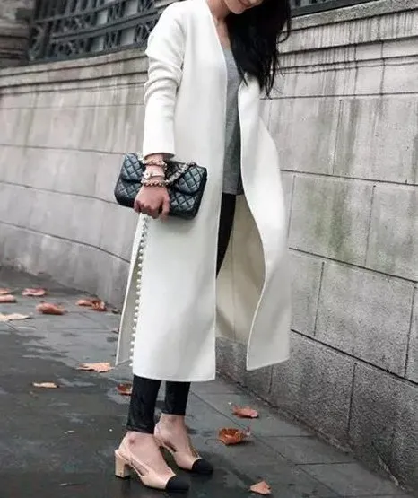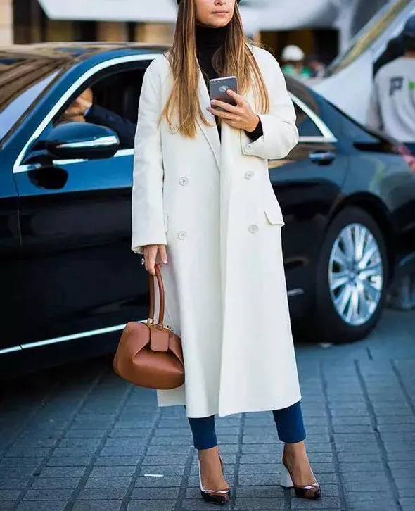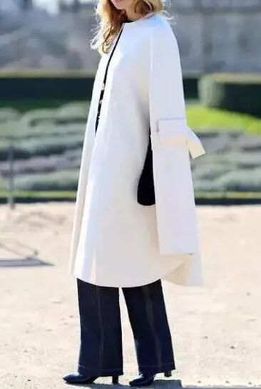 4. 白色大衣+ 阔腿裤阔腿裤可以说人手要必备几条,有型又显瘦,搭配白色大衣也是十分有范。大衣搭配阔腿裤和高跟靴气场十足又不失洒脱。