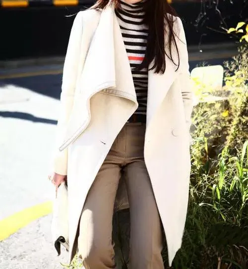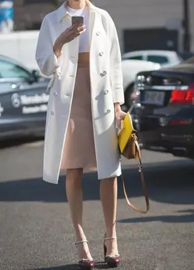6.白色大衣+高腰半身裙白色大衣搭配裸色系单品也是极美的。当然,白色本就百搭。只是选择一些柔和的百搭色更显高级,比如黑白灰和裸色、墨绿等纯度低的色彩。白色大衣内搭裸色高腰半裙,配上极具复古风味的粗跟鞋更显清新优雅。