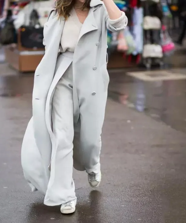 3.灰白色大衣+同色单品长款灰白色大衣搭配同色深V针织衫简直美呆,配上大热的高腰阔腿裤 ,显高又腔调十足, 鞋子也可选择小白鞋,整个LOOK简直就是一个大写的时髦。