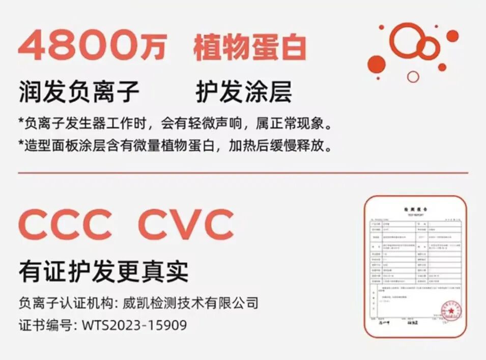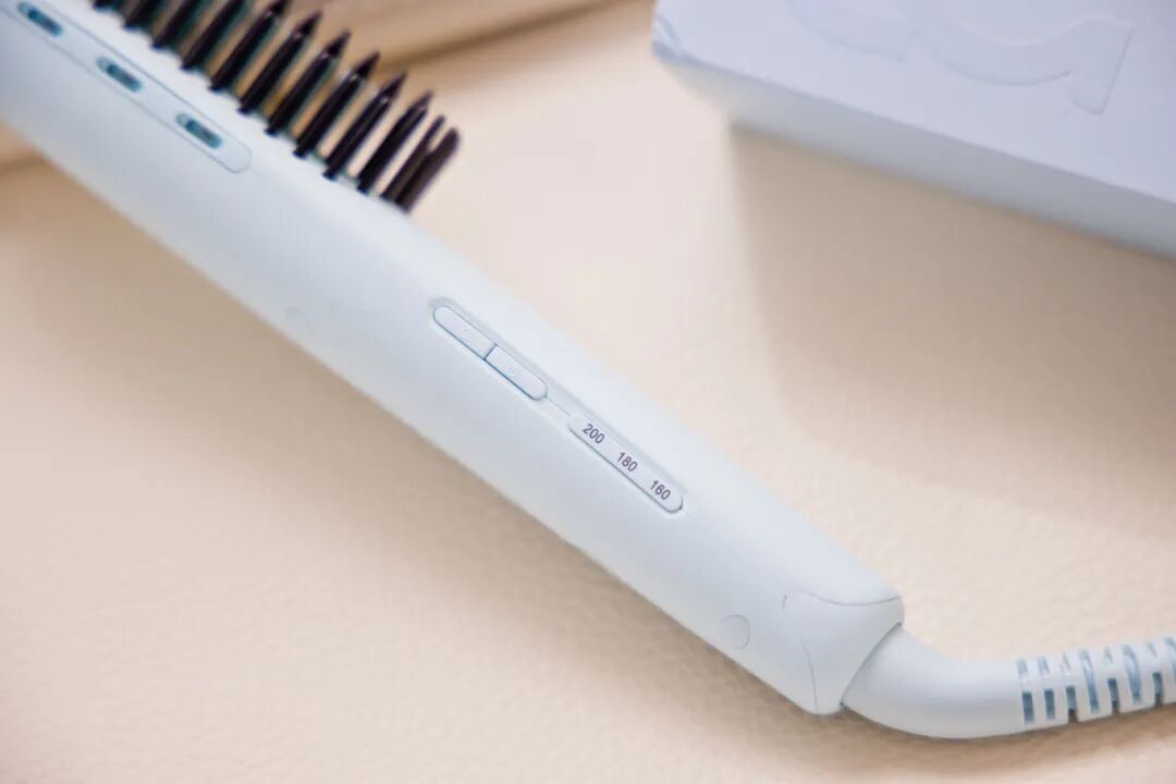梳子做了 3 个负离子喷口,插电后负离子会收拢头发的毛鳞片,减少静电产生。面板涂层中还融入了微量植物蛋白,加热时自动释放护发因子。