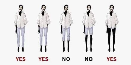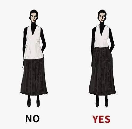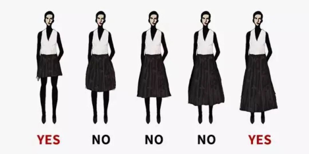 首先,露腿有诀窍,不是所有的把腿漏出来就美了,看下图,可以很明显的看出随着裙子的加长人的中心也越来越往下移走,到最长的时候,下半身成为了一个整体的时候,然而视觉感也微妙的成为了一个整体反而会显得很长……
