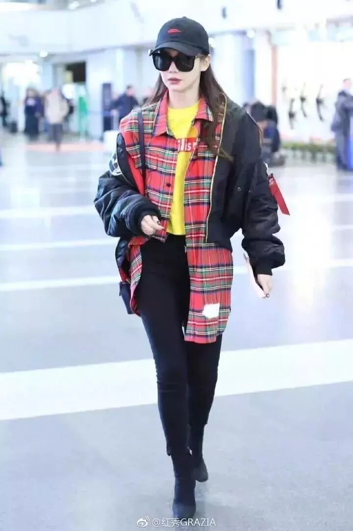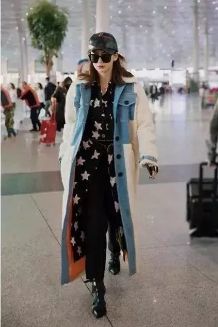就如上图的机场照一般,戚薇喜欢在外套中叠加一件格子衬衣,,使整个造型多了些层次感,用简单的单品叠加出不一般的时尚,既有个性又百搭~