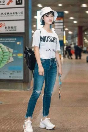 沈月的优势就在于清纯可爱的样子和娇小感,给人强烈的保护欲,私下她的穿搭也比较简单可爱一些。一件白T,海蓝色牛仔裤,白色运动鞋再是简单不过了,不过一个渔夫帽显得俏皮可爱。