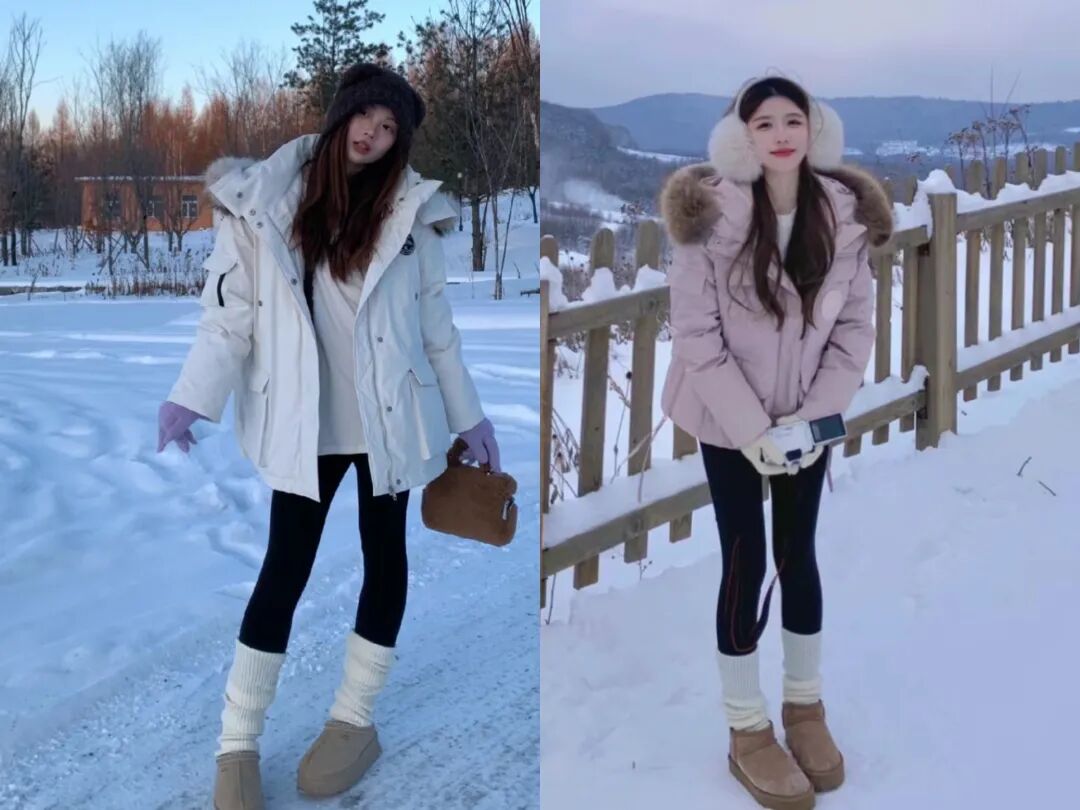 用一双棕色的雪地靴和白色的堆堆袜打造层次感,这一身装扮也很出片,可以穿去旅游也可以上班通勤,让你在冬天也能享受自由和快乐。