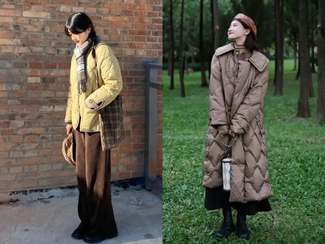 比如,你可以选择一件奶黄色的奶奶棉服搭配棕色灯芯绒阔腿裤、黑色小皮鞋,围上一条复古格子围巾。