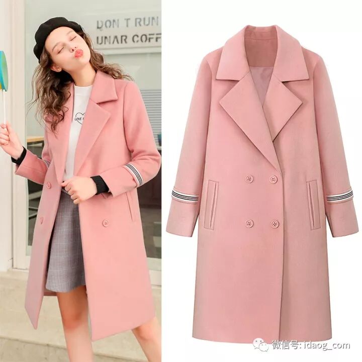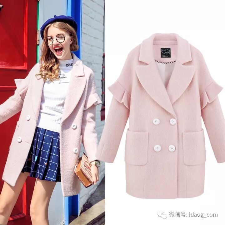 少女粉的大衣,特别显活泼和青春,双排扣设计简单大方,袖口的花边丰富视觉体验~