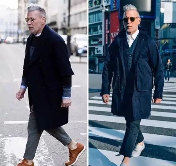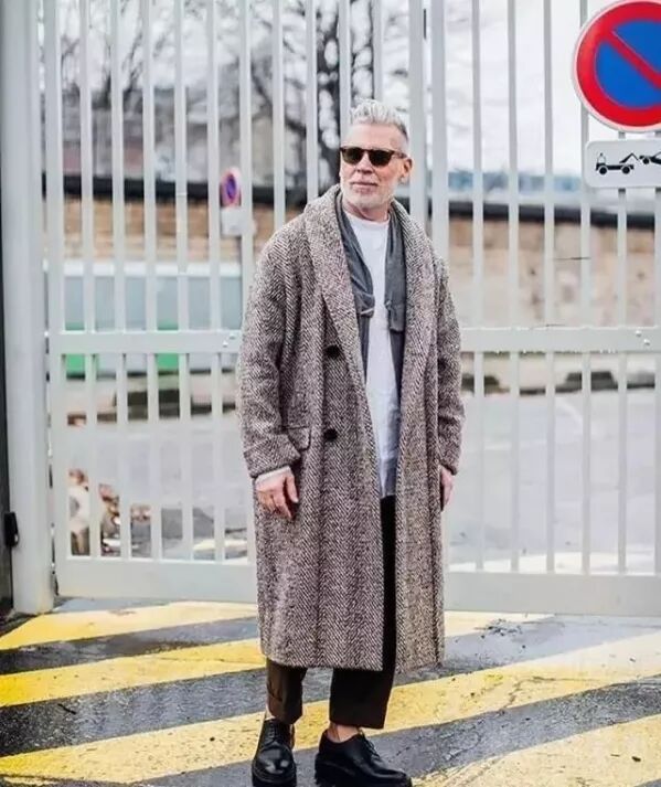 Nick大叔的大衣搭配很简单,颜色都是最经典的黑灰驼,搭配就是九分锥形裤,不是太冷基本上都是低帮鞋露脚踝;