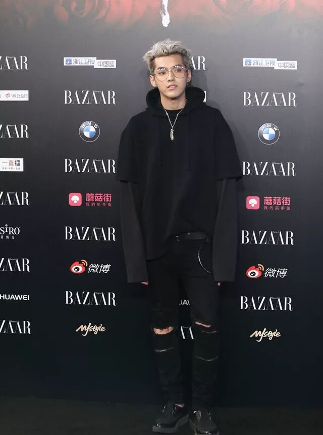 ▲Kris这一身ALL BLACK,充满了设计感,拼接袖子的卫衣配破洞牛仔裤,简直不要太酷,再配一条高桥吾郎的羽毛项链,优秀~