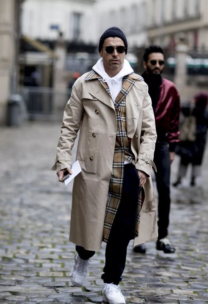 卫衣是自带休闲感的单品,而风衣则相对正式,叠穿则可以很好的平衡这两种感觉,消除掉那种“大人感”。