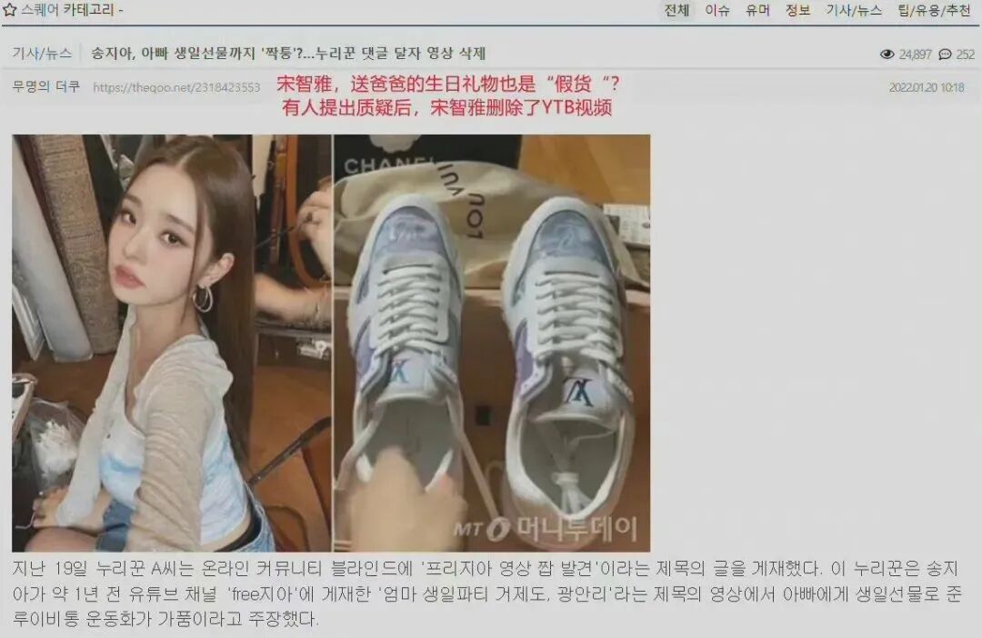 随着一件“香奈儿针织短袖”被扒出是假货,她的不少衣服、鞋子、项链都随之被扒出是山寨货,就连Vlog里送给爸爸的鞋子都是假的。恋综里和宋智雅配对成功的男嘉宾也在她翻车后迅速取关,韩国另一档已经录制好的综艺节目也删除了她的全部镜头。有人评价道,大概宋智雅塑造独立清醒富家千金人设,就是为了来中国捞钱好买正品吧。从恋综女王到营销女屌,宋智雅的反转只用了30天。