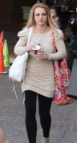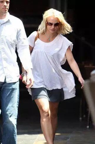 衣服的尺寸,绝对不能包在身上,这样绝对显胖。穿过于肥大的衣服则让整个人看上去像一个大大的口袋,略微宽松是最好的选择。布兰妮却将这两种极限都穿上了,松垮的软软的白t,邋遢又无型;紧身的露点T恤将腰部的赘肉显露出来。