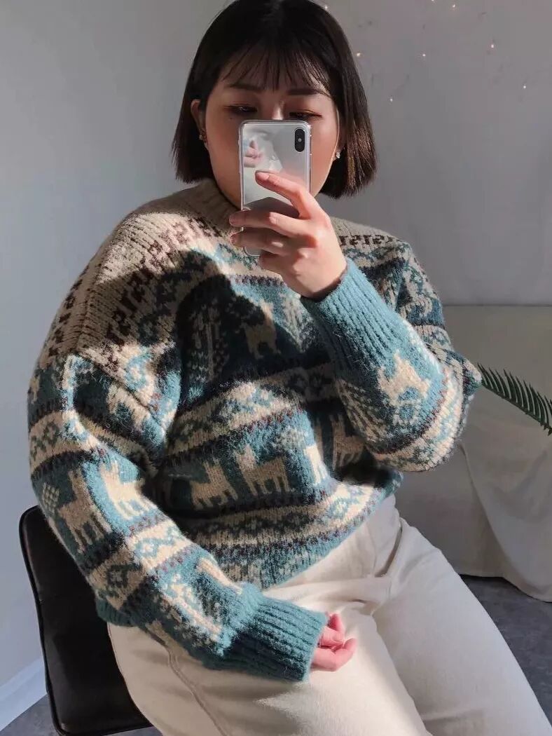 圆领套头毛衣可以说是馆主的最爱了,衣橱里肯定是要必备几件的,宽大的圆领毛衣可以遮住上身的所有缺陷,胖仙女们都知道,脖子那可是我们的致命缺点啊,因为短!!所以买一件圆领短套头毛衣可以稍稍露出脖子,还显的整个人时尚又复古。