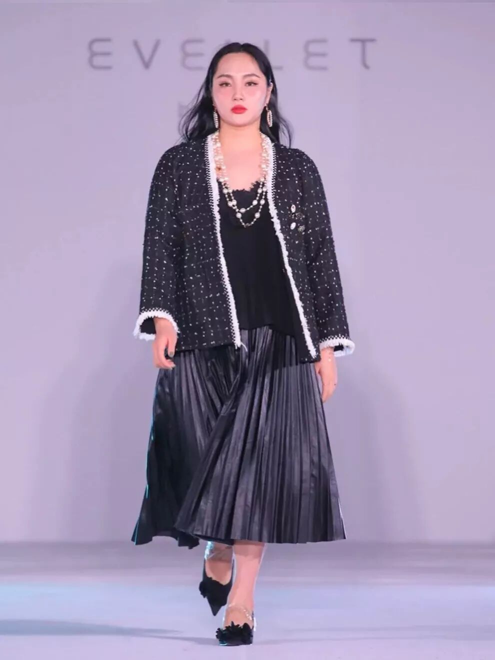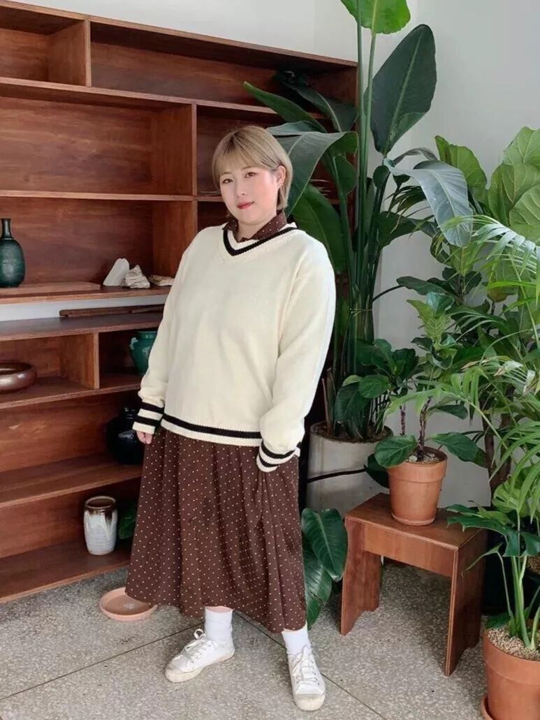 水貂的小香风类型,优雅而又充满女人味,落肩的设计柔和了胖仙女们的肩部线条,温柔婉约,时尚满满。