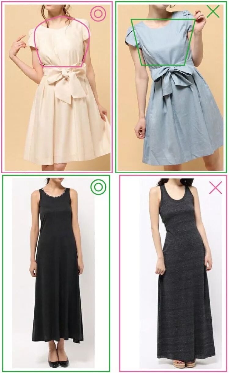 上图绿框为标准体中间型,玫红框为扁薄体型,标准体中间型在穿略修身长款重心朝下的底部为A型的连衣裙时,身体线条才会显得较好,穿偏X型的膝上连衣裙时,反而显得有点啰嗦繁琐。