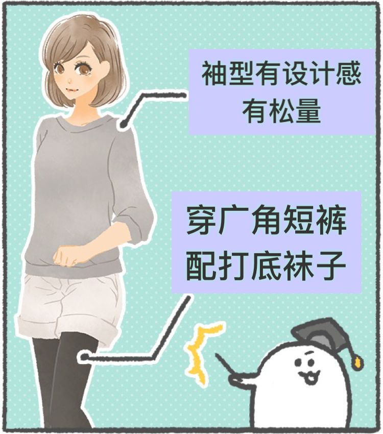 选有松量的袖子上衣配广角短裤(不修身的短裤)配个打底袜或者legging 就会很活泼了。