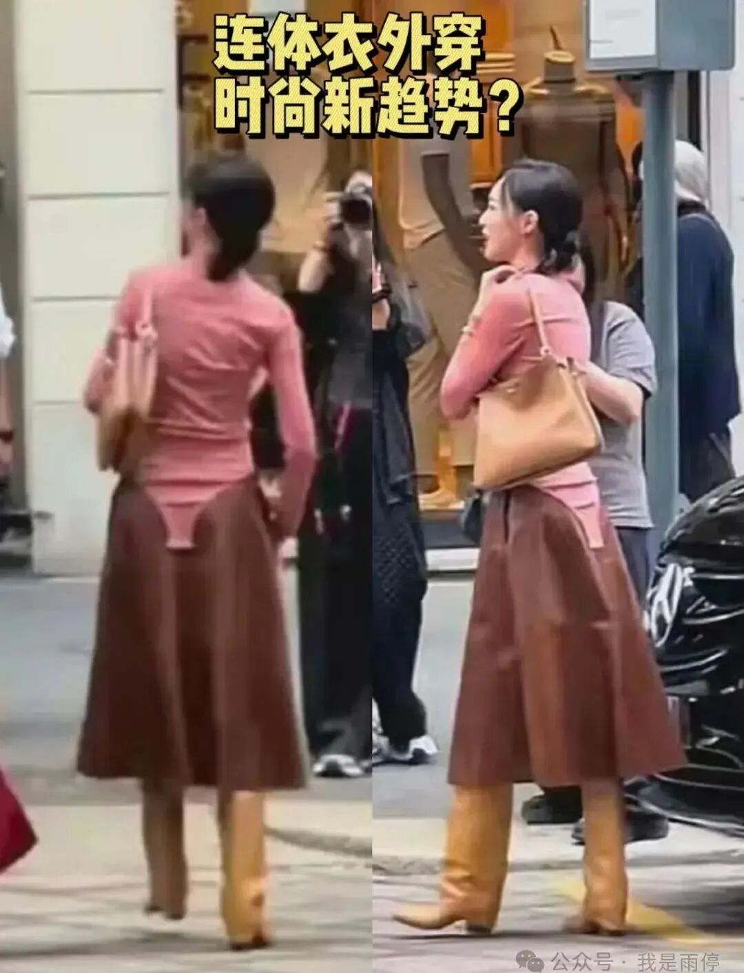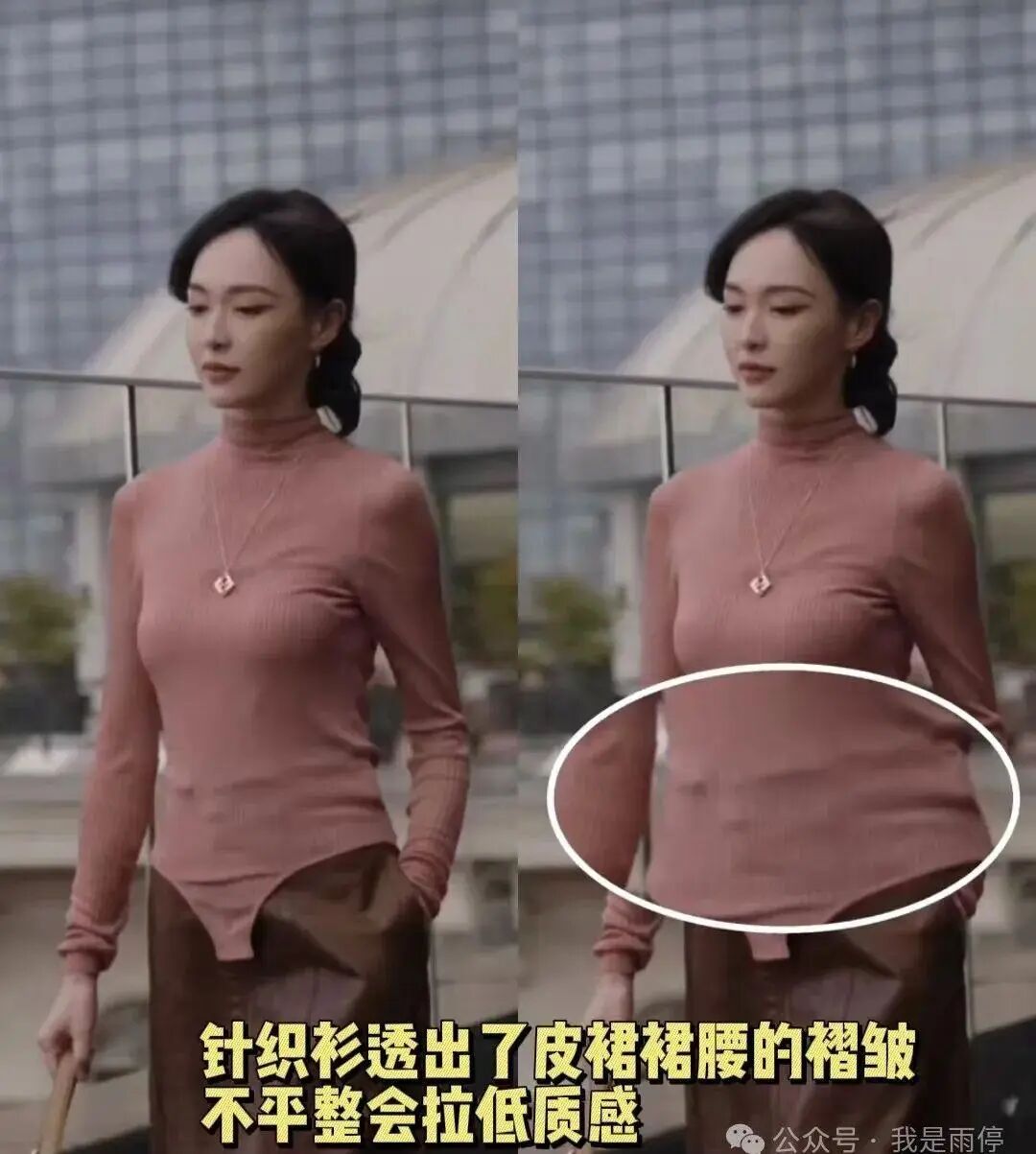 唐嫣的皮裙可能有点大,穿上后针织连体衣就容易显出不平的印子来。