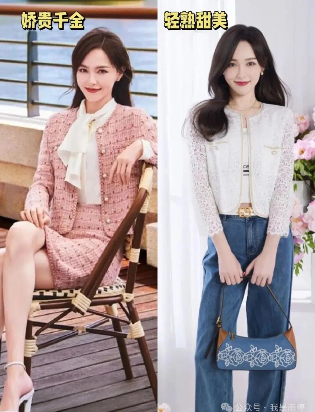 唐嫣很会穿小香风衣服。看她左边那套,里面配了件白衬衫,飘带设计,看着就像富家千金。右边呢,小香风外套搭牛仔裤,完全是职场美女的样子。但这外套袖子有点短,唐嫣穿上稍微有点紧。